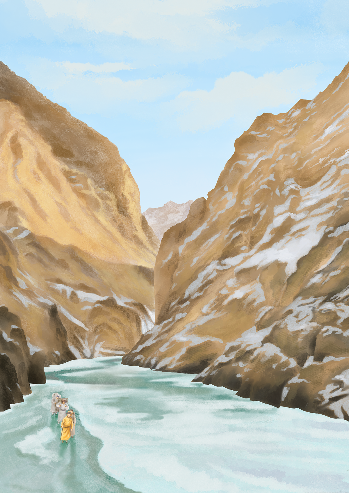 The story goes that while returning from Leh, King Skyalzos and his party—a cook and two helpers—faced a grave challenge midway through their journey. One morning, after spending the night in a cave, they awoke to find the river ice completely melted, leaving only bright blue flowing water. Trapped within the steep Zanskar gorge, their sole hope was for the temperature to drop long enough for the river to freeze again.