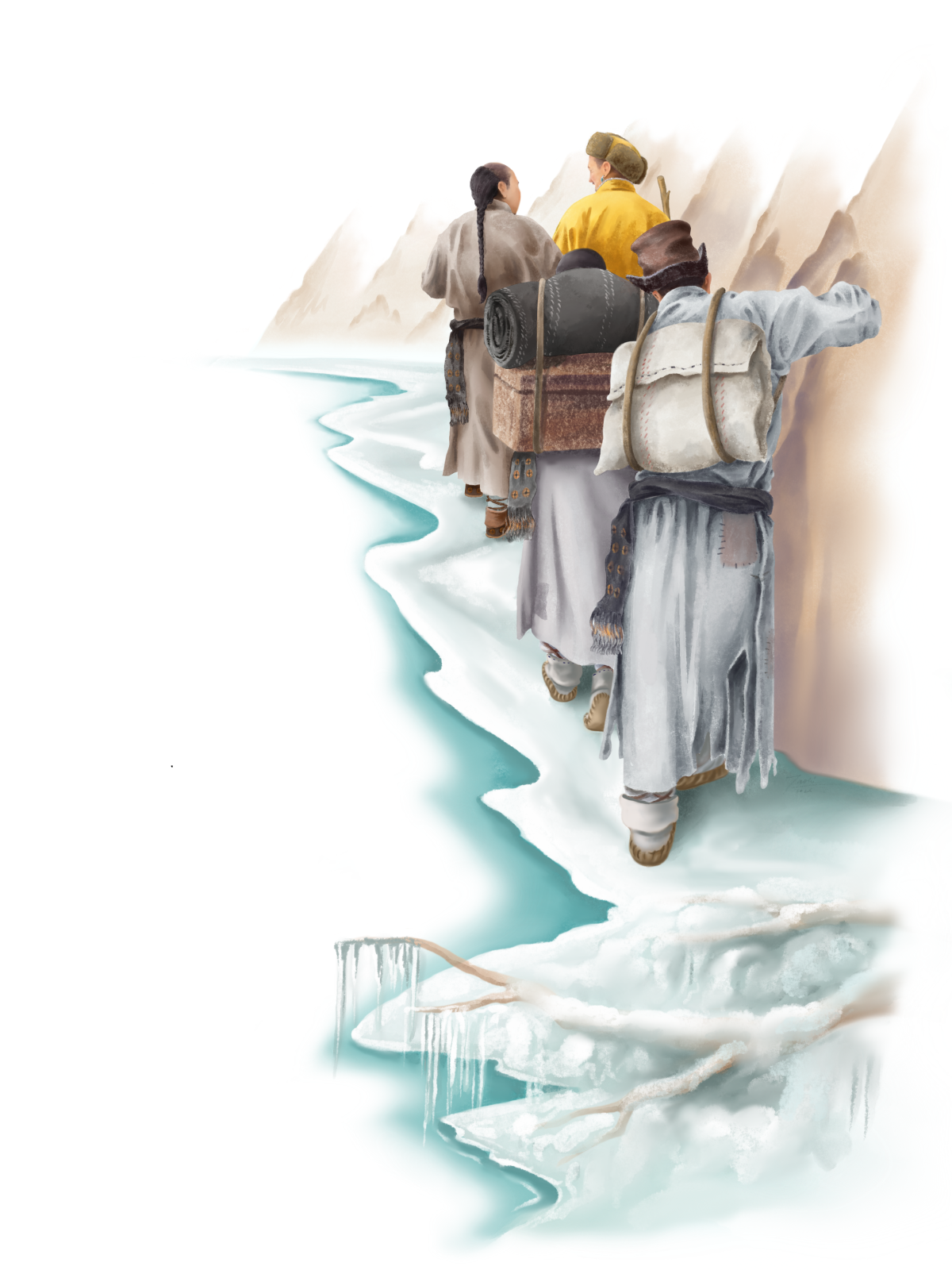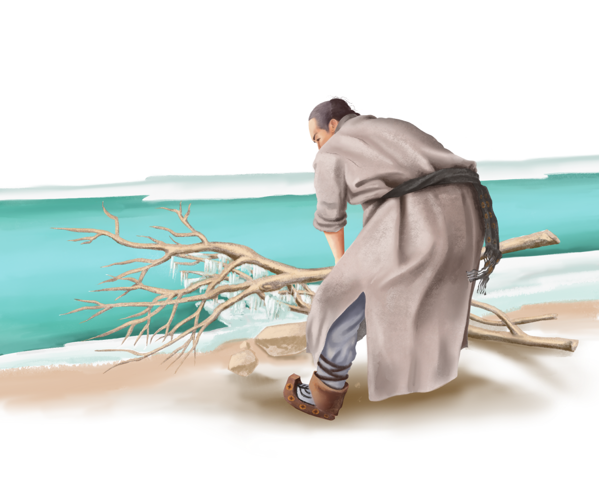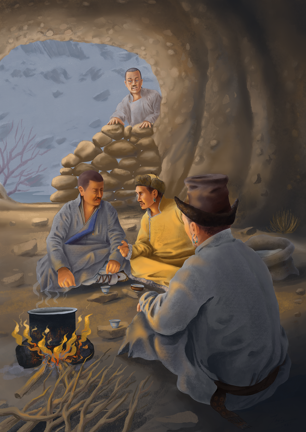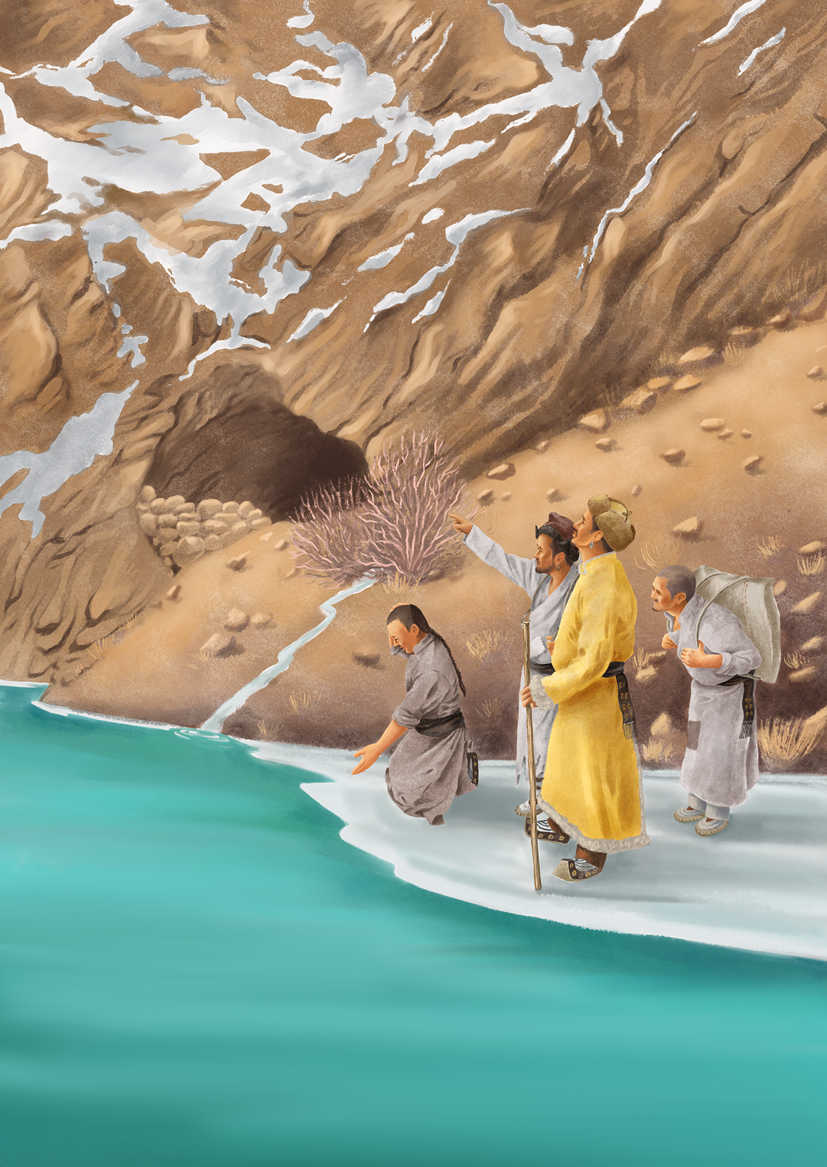One day, while the cook was out fetching water, the king and the porters made a plan. If the ice was still not frozen the next day, they would kill the cook, just to survive. Luckily, the cook overheard them. That night, he went down to the river, prayed, and then cut a tree branch and placed it in the water. As lumps of ice floated by, they started to collect around the branch. Before he returned to the cave, he prayed again, hoping for the water to freeze so he could escape alive and see his family again.