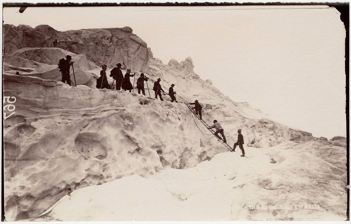 The most telling evolution within these images, though, is not the ice, but the human figures standing upon it. The representation of humans in glacier imagery reflects the sociological development of Alpinism from scientific inquiry to sporting conquest and bourgeois mass tourism.