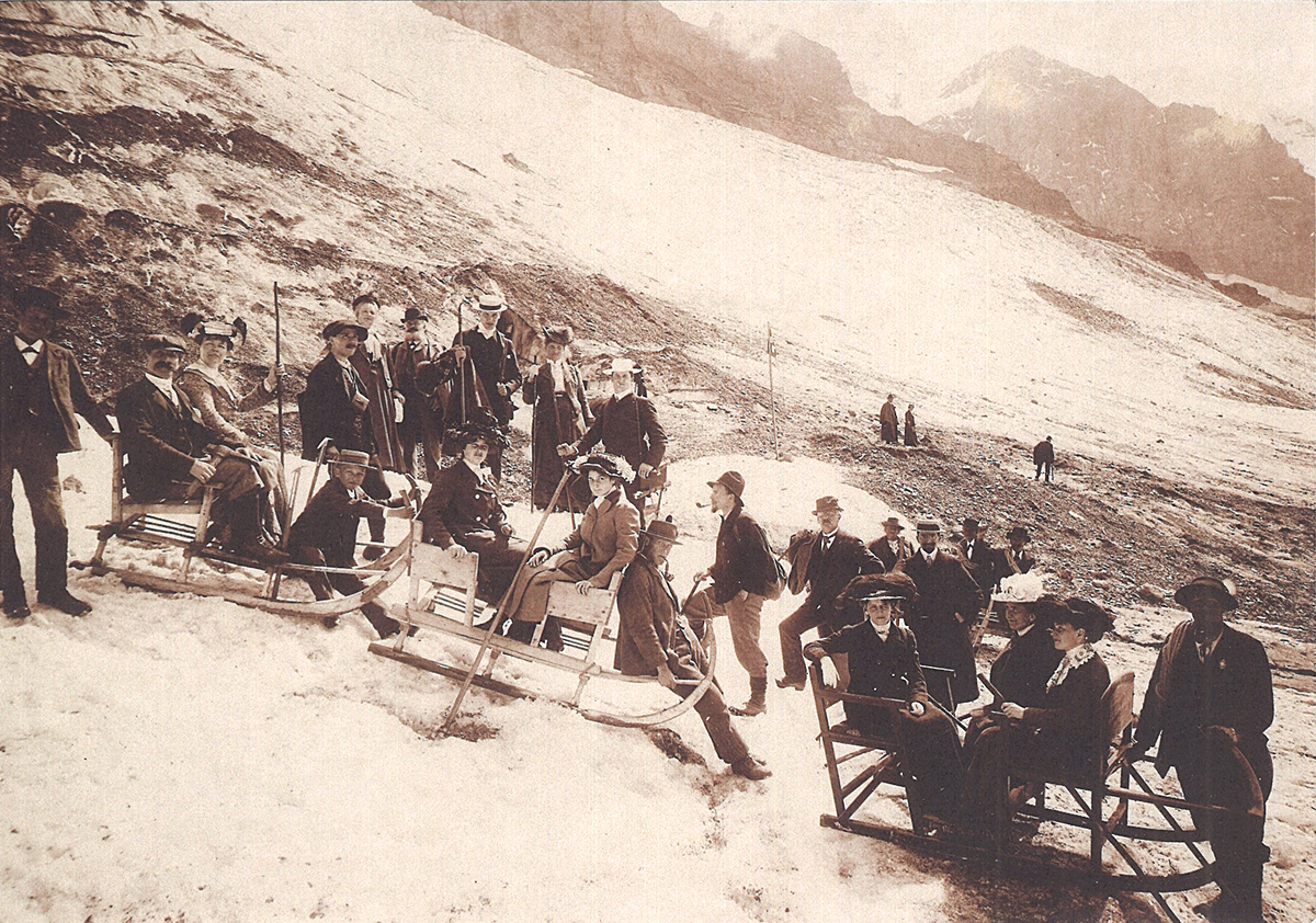 Consider the images of bourgeois tourists crossing the Glacier de Bossons or posing on the Eiger glacier with sledges. These were not snapshots of exploration; they were carefully curated acts of self-representation, providing a clear distinction from anonymous mass-produced postcards. The presence of tourists in urban attire on the ice, often framed by unseen guides and photographers, served a clear social function. Just as the Grand Hôtel offered a venue for display, the glacier offered a backdrop for projecting an image of adventurous modernity. The infrastructure of the era catered to this desire. The construction of cog railways, such as the line to the Jungfraujoch, was specifically intended to provide desirable glacier views for those unwilling to climb (König 2000; Rohr 2023).